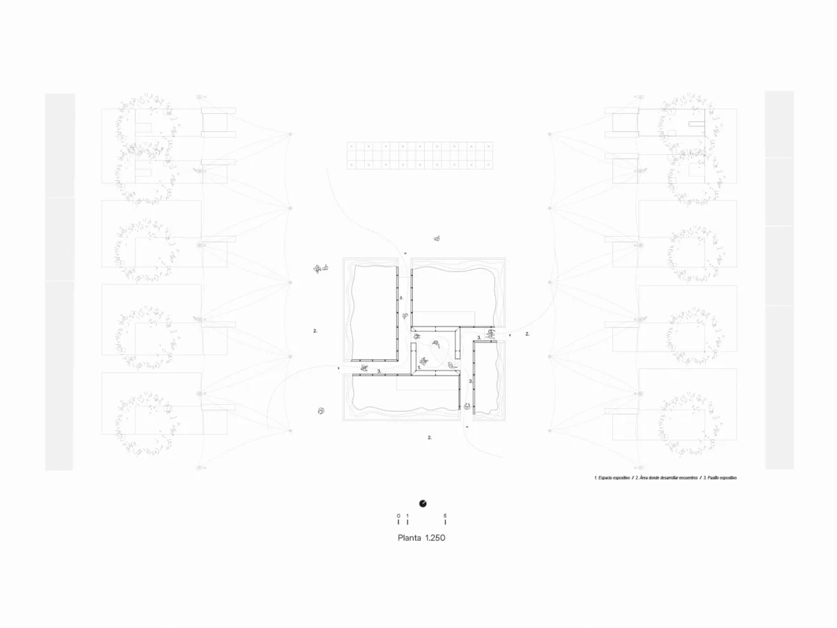 Desde el centro urbano emergemos hacia el exterior, hacia el entorno y sus recursos, haciendo transversales cuestiones sociales y climáticas. Encareciendo valores vernáculos, modos de vida tradicionales sumamente sostenibles con el desarrollo económico y social.  El interior del pabellón se convierte en una sala de conocimiento y en su entorno se organizan múltiples encuentros.